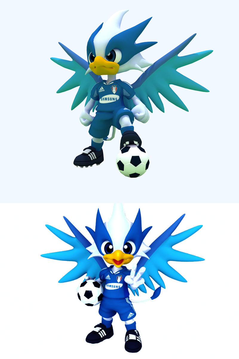 특히 등에 단 푸른 날개는 서포터스가 응원시 사용하는 60 x 15미터 사이즈의 국내 최대 초대형 통천 디자인에서 따온 것으로 축구단과 서포터스의 일체를 의미합니다.