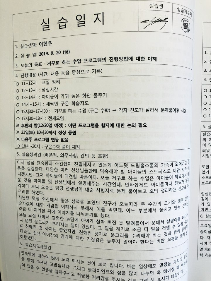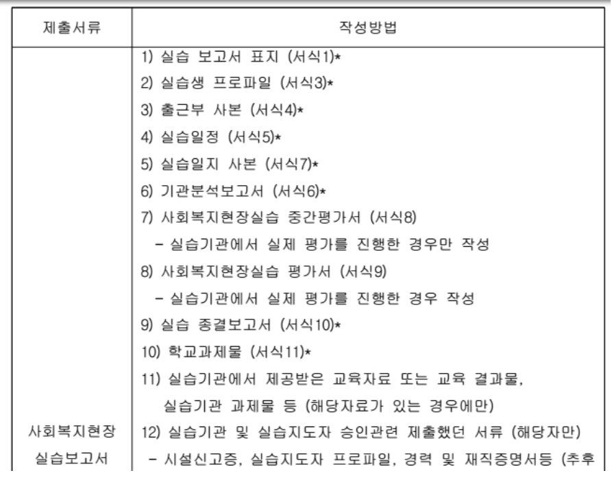 11. 실습일지는 해당 실습기관의 지도자와 상의하여 실습기관의 지도자의 자필 피드백을 받을지? 해당 실습기관의 실습생용 PC에 저장해둬서 당일 실습종료시간에 실습일지를 작성한 이후 실습지도자가 PC열람 이후 워드로 피드백을 받을 것인지 기관사정이나 기관지도자와 실습생간의 협의를 통해 결정한다.