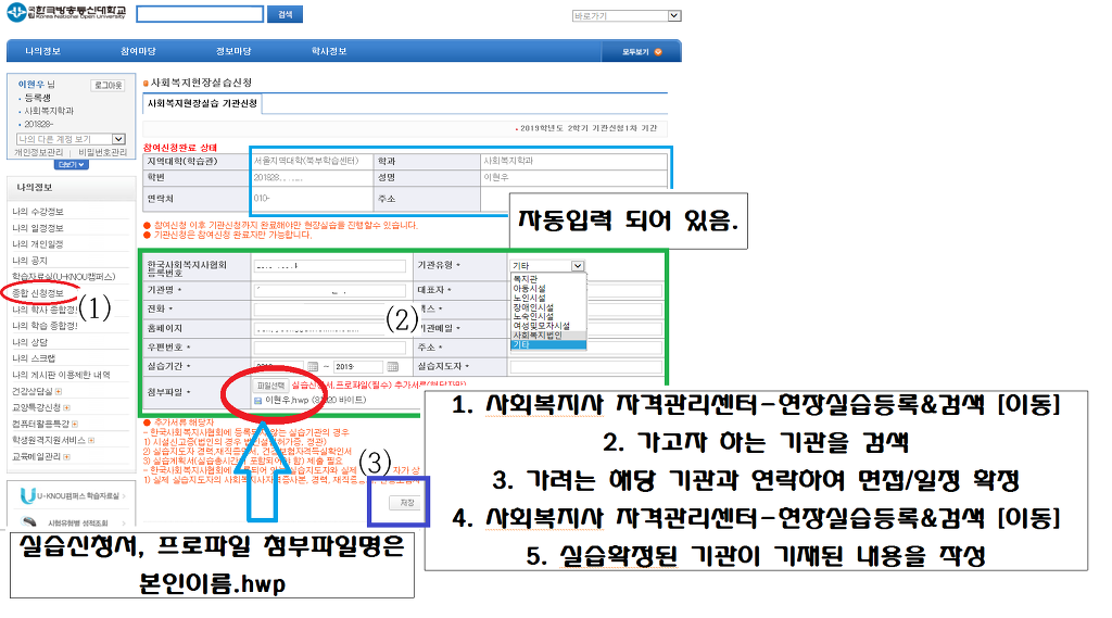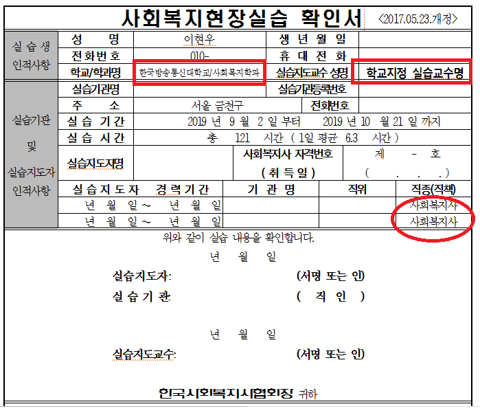 16. 실습확인서에서 실습생이 작성해야 할 칸은 성명~실습기간까지 작성하면 된다. (학교/학과명은 반드시 한국방송통신대학교 사회복지학과로 기재해야 한다. 아울러 실습지도교수는 학교에서 지정한 실습교수명이지, 학과의 교수명을 기재하면 안됨. 실습지도자의 직종(직책)은 사회복지사라고 기재한다. 아래와 같이 기재한 뒤에 실습지도자에게 확인서 파일을 워드로 타이핑한 뒤에 인쇄해서 받는다. 실습평가서와 동봉해버리면 할 수 없지만)