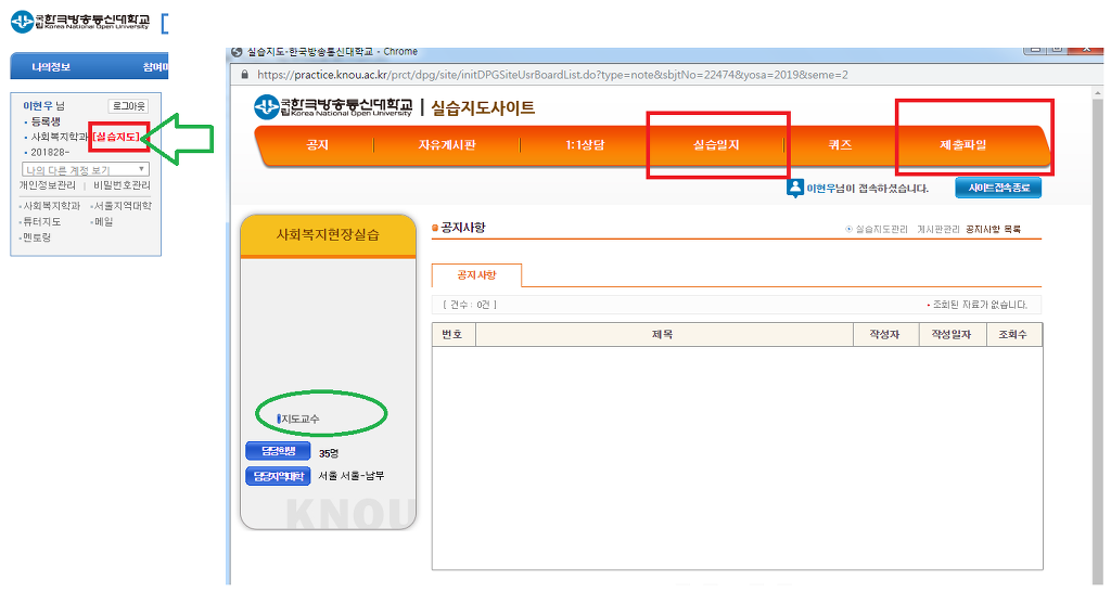 6. 실습신청 약 40~45일이 경과를 하면 학교 홈페이지 로그인을 하시면 학과명 옆에 [실습지도]라는 빨간색 글씨가 자리하게 됩니다. 그걸 클릭하면 아래처럼 팝업창이 생깁니다.