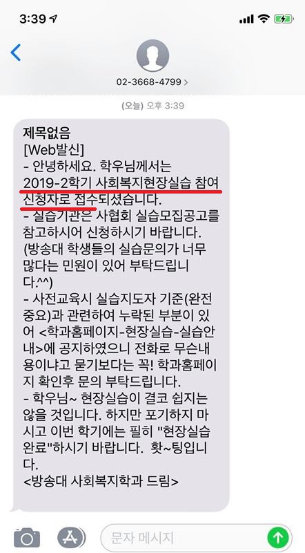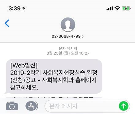 (2020.1학기 사회복지현장실습을 진행하였다면, 2020년 7월말~8월쯤에 이 문자를 받지 않나 싶음)