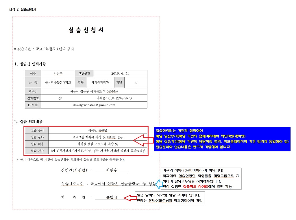 또한 실습하고자 하는 실습기관의 대표자(또는 시설장)가 실습관리자(또는 슈퍼바이저)일 경우엔 반드시 그 실습관리자의 건강보험 자격득실확인서를 이미지 혹은 pdf 같은 첨부파일을 받은 뒤에 앞서의 문서(서식2+서식3)를 더해서 실습담당 교수에게 이메일로 반드시 제출해야 합니다. 그래야만 실습신청 최종 승인이 이뤄지게 됩니다.