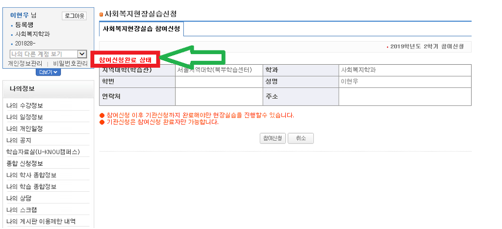 화면 하단의 중앙에 [수강/수업/성적]-[사회복지현장실습참여신청]