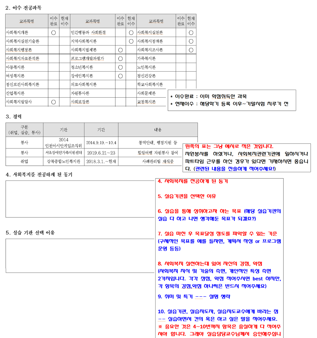 예: 간혹 실습기관에서 지정한 출근부가 따로 있다면 해당기관의 출석부로 작성한다. 물론 이것 또한 모두 자필로 해야 한다.