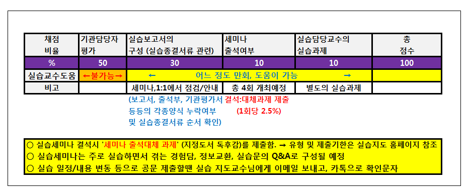 1차 세미나때 설명한 현장실습배점에 대한 설명은 아래와 같다. (실습세미나의 세부적인 방법과 일정은 각 그룹마다 차이가 있음)