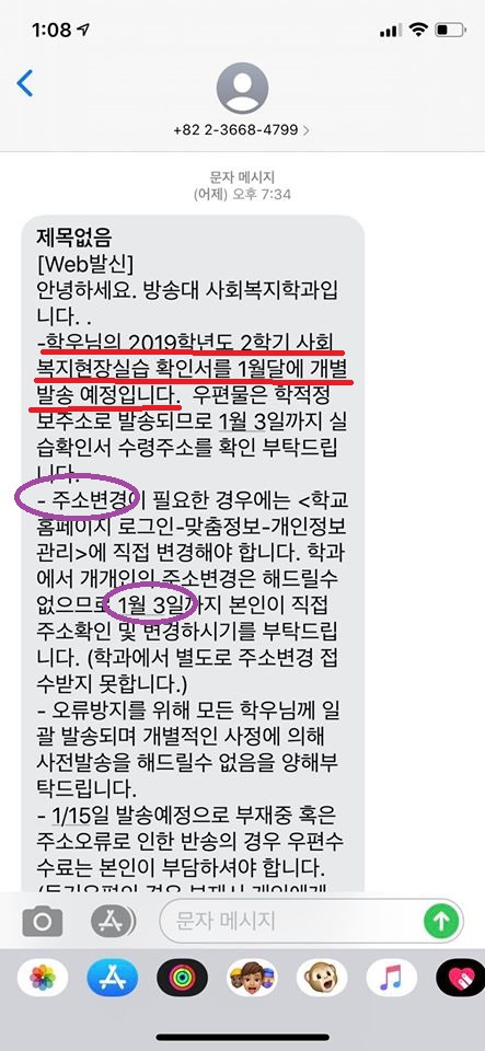 21. 연말이 다 되어서 학교(정확히 말하면 학과측에서 문자전송)에서 연락이 온다. 사회복지현장실습 확인서를 배송하겠다는 문자가 온다. 배송하기 전에 수신 가능한 주소가 맞는지 다시 한 번 확인해달라는 내용이다.