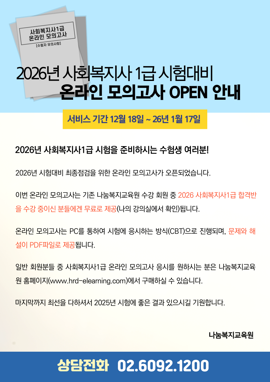 2026년 사회복지사1급 시험대비 온라인 모의고사 오픈 안내 작성자형준쌤|작성시간25.12.19|조회수29 목록 댓글 0 글자크기 작게가 글자크기 크게가 다음검색 현재 게시글 추가 기능 열기 북마크 공유하기 신고 센터로 신고 댓글 댓글 0 댓글쓰기 답글쓰기 댓글 리스트