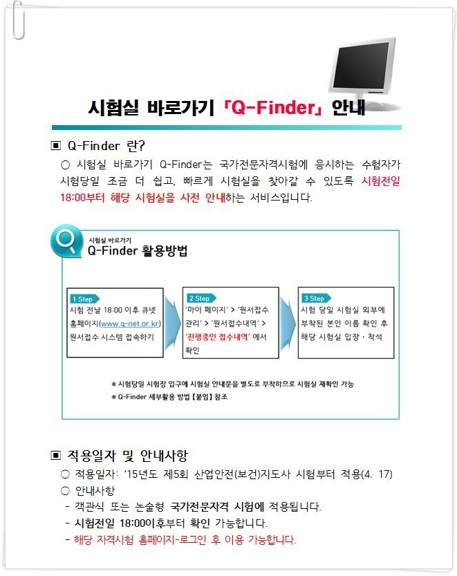 직업상담사 시험실 바로가기『Q-Finder』안내 작성자나눔씨앗~♬|작성시간15.04.17|조회수55 목록 댓글 0 글자크기 작게가 글자크기 크게가 ※ Q-Finder 세부활용방법은 첨부파일을 참고하시기 바랍니다 Q-Finder 안내문.hwp 첨부파일첨부된 파일이 2개 있습니다. jpg 파일 Q넷.jpg 다운로드 hwp 파일 Q-Finder 안내문.hwp 다운로드 다음검색 현재 게시글 추가 기능 열기 북마크 공유하기 신고 센터로 신고 댓글 댓글 0 댓글쓰기 답글쓰기 댓글 리스트