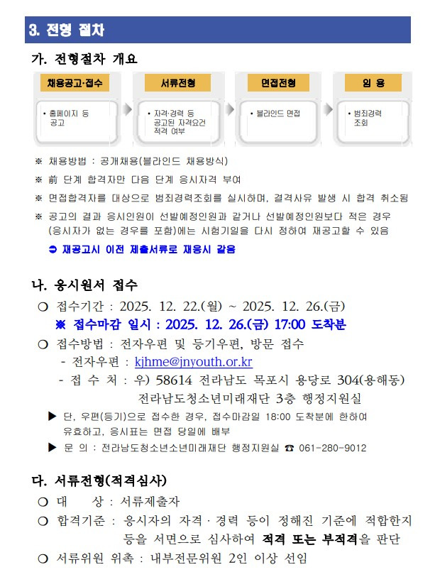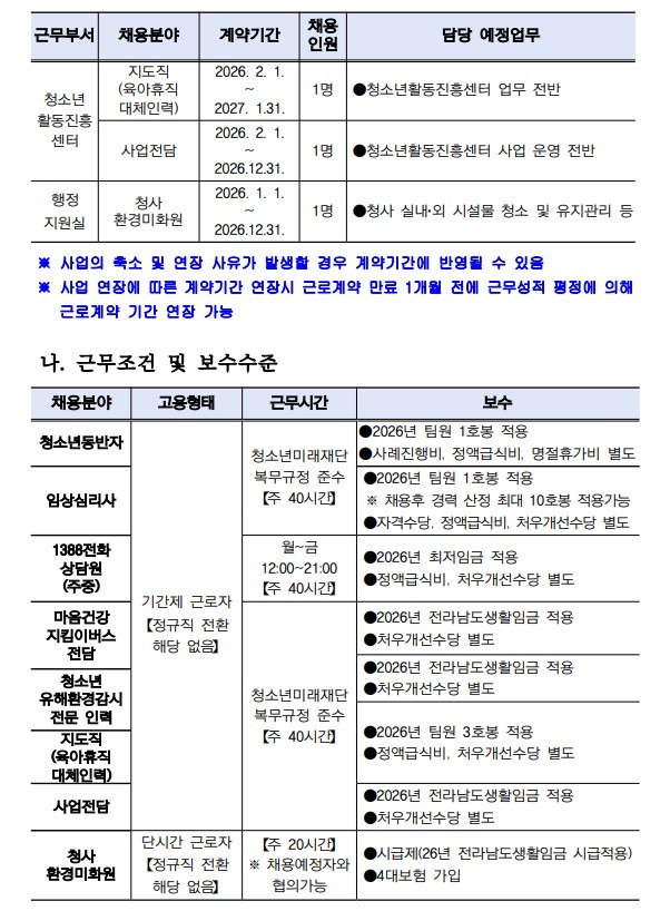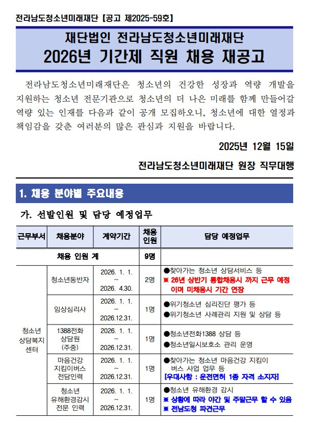 전라남도청소년미래재단 기간제 직원 채용 재공고 작성자나눔씨앗~♬|작성시간25.12.16|조회수8 목록 댓글 0 글자크기 작게가 글자크기 크게가 출처: 전라남도청소년미래재단 홈페이지: https://counsel.jnyouth.or.kr/ 다음검색 현재 게시글 추가 기능 열기 북마크 공유하기 신고 센터로 신고 댓글 댓글 0 댓글쓰기 답글쓰기 댓글 리스트