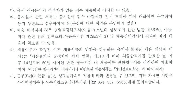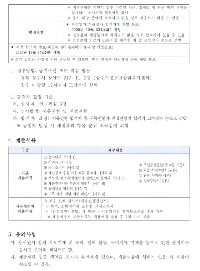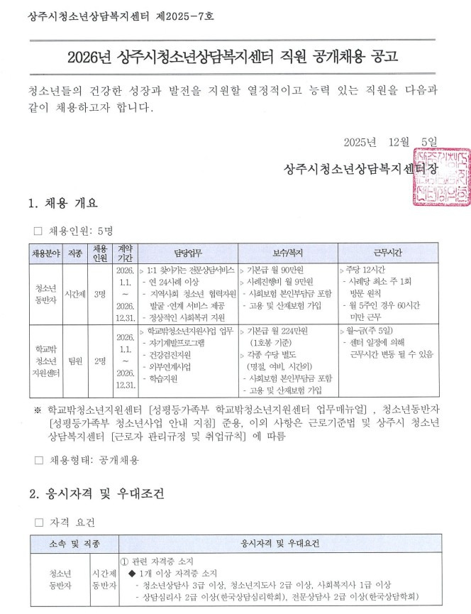 상주시청소년상담복지센터 직원 공개채용 공고 작성자나눔씨앗~♬|작성시간25.12.16|조회수21 목록 댓글 0 글자크기 작게가 글자크기 크게가 출처: 상주시청소년상담복지센터링크: http://www.sj7942.org/bbs/board.php?bo_table=sj_notice&wr_id=398 다음검색 현재 게시글 추가 기능 열기 북마크 공유하기 신고 센터로 신고 댓글 댓글 0 댓글쓰기 답글쓰기 댓글 리스트