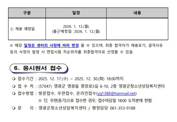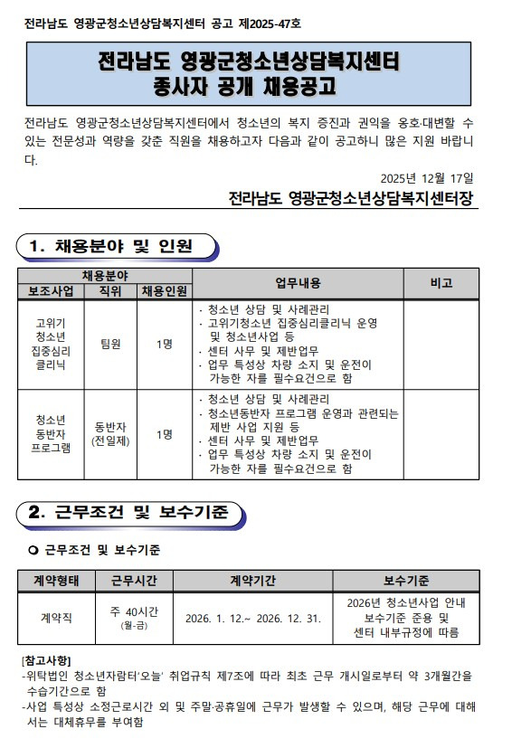 영광군청소년상담복지센터 종사자 공개 채용공고(집중심리클리닉, 청소년동반자) 작성자나눔씨앗~♬|작성시간25.12.22|조회수9 목록 댓글 0 글자크기 작게가 글자크기 크게가 출처: 영광군청소년상담복지센터홈페이지: https://www.yg1388.or.kr/open_notice/188 다음검색 현재 게시글 추가 기능 열기 북마크 공유하기 신고 센터로 신고 댓글 댓글 0 댓글쓰기 답글쓰기 댓글 리스트