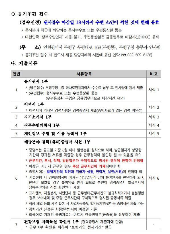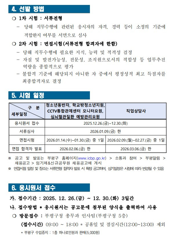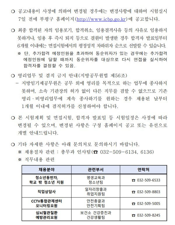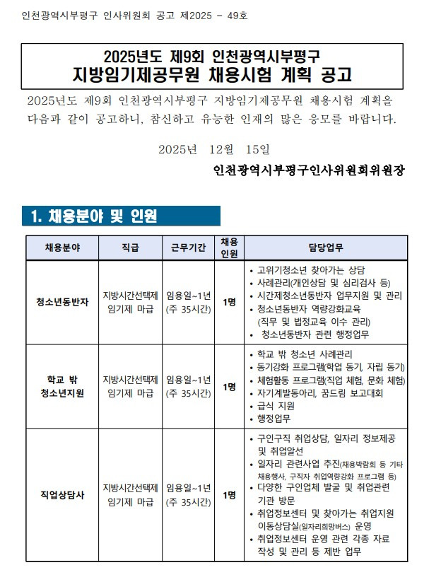 인천광역시부평구 지방임기제공무원 채용시험 계획 공고(청소년동반자, 학교밖청소년지원, 직업상담사포함) 작성자나눔씨앗~♬|작성시간25.12.19|조회수14 목록 댓글 0 글자크기 작게가 글자크기 크게가 출처: 부평구링크: https://www.icbp.go.kr/main/bbs/bbsMsgDetail.do?msg_seq=539&bcd=recruit_official 다음검색 현재 게시글 추가 기능 열기 북마크 공유하기 신고 센터로 신고 댓글 댓글 0 댓글쓰기 답글쓰기 댓글 리스트