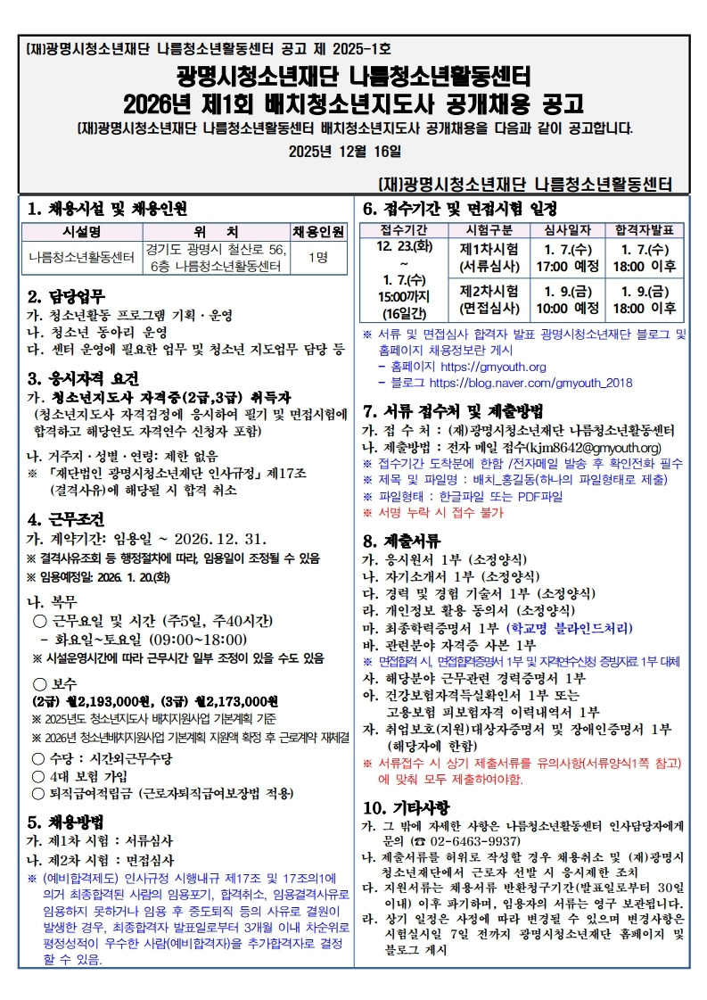 광명시청소년재단 나름청소년활동센터 배치청소년지도사 공개채용 작성자나눔씨앗~♬|작성시간25.12.19|조회수10 목록 댓글 0 글자크기 작게가 글자크기 크게가 출처: 광명시청소년재단링크: https://gmyouth.or.kr/nareum/selectBbsNttView.do?key=1248&bbsNo=36&nttNo=7063 다음검색 현재 게시글 추가 기능 열기 북마크 공유하기 신고 센터로 신고 댓글 댓글 0 댓글쓰기 답글쓰기 댓글 리스트