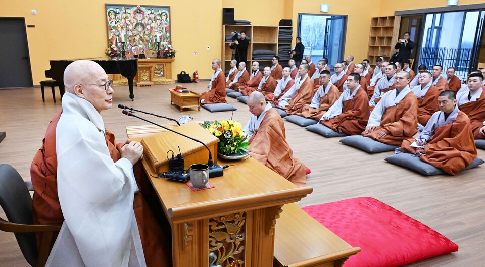 총무원장 진우스님이 '2024 군승 안거 포살' 법회가 열린 계룡대 호국 홍제사에서 특별법문을 하고 있다.