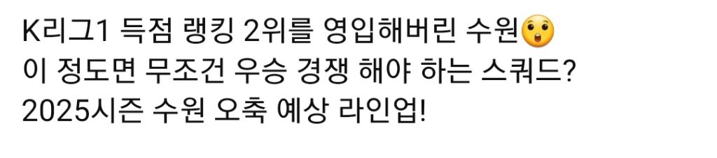 [스크랩] [오늘의축구] 25 수원삼성 오축 예상 라인업 작성자Kflaqqr|작성시간25.01.23|조회수288 목록 댓글 1 글자크기 작게가 글자크기 크게가 http://youtube.com/post/UgkxPybgAxHKYh6kPREdUrcGcXEc-6tDrrWN?si=PmpSuQoHFFnbeHRL오늘의 K리그님의 게시물K리그1 득점 랭킹 2위를 영입해버린 수원😲 이 정도면 무조건 우승 경쟁 해야 하는 스쿼드? 2025시즌 수원 오축 예상 라인업! 📱 K리그 필수앱, #오늘의K리그 🧢 오축이 만든 'VAR 모자'를 검색해보www.youtube.comhttps://www.instagram.com/p/DFKRZIWJ2g0/?igsh=NnEyYzJ6OTl2eHV3 다음검색 스크랩 원문 : 樂soccer 현재 게시글 추가 기능 열기 북마크 공유하기 신고 센터로 신고 댓글 댓글 1 댓글쓰기 답글쓰기 댓글 리스트 작성자둘하나 | 작성시간 25.01.30 화이팅 댓글 전체보기