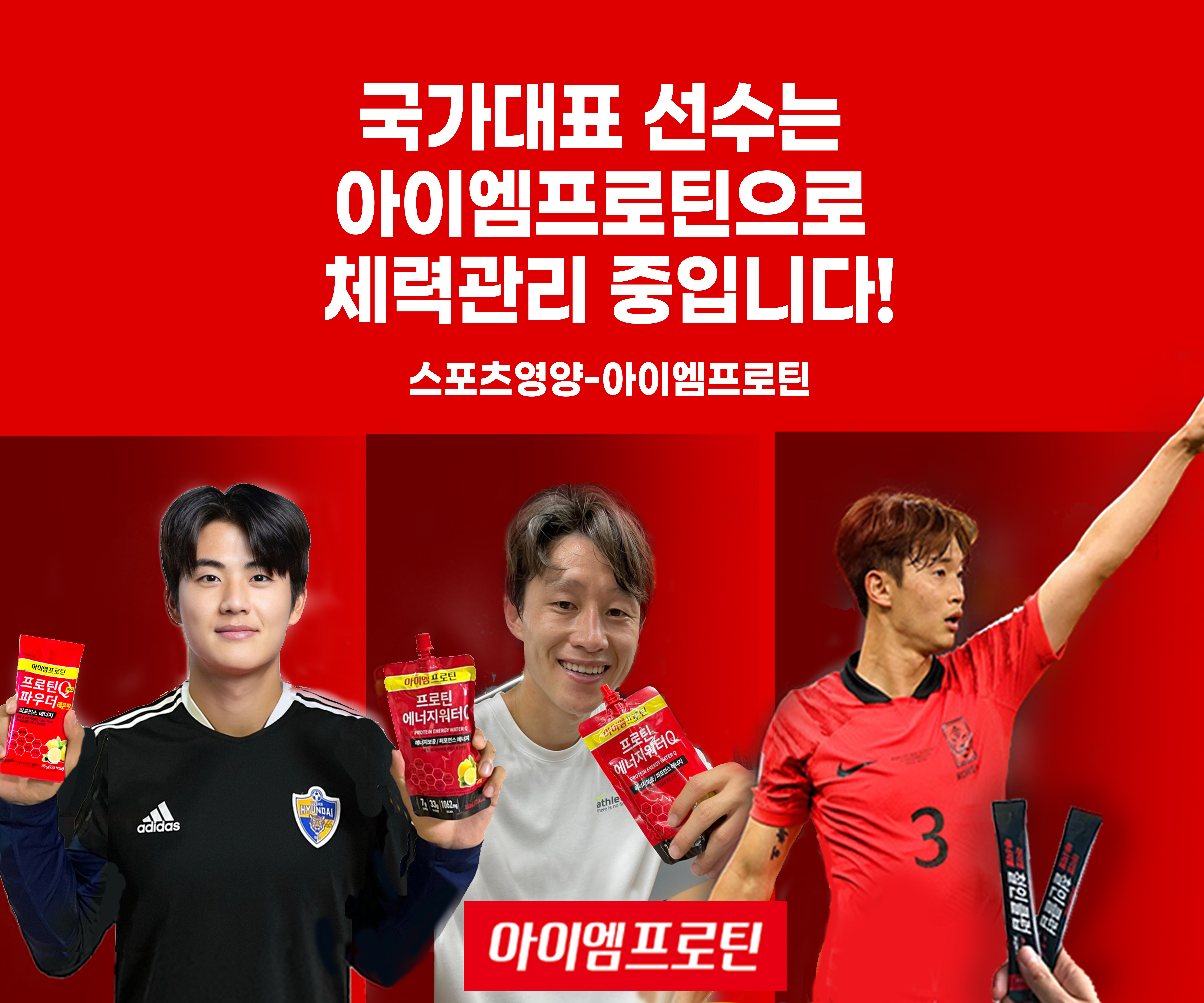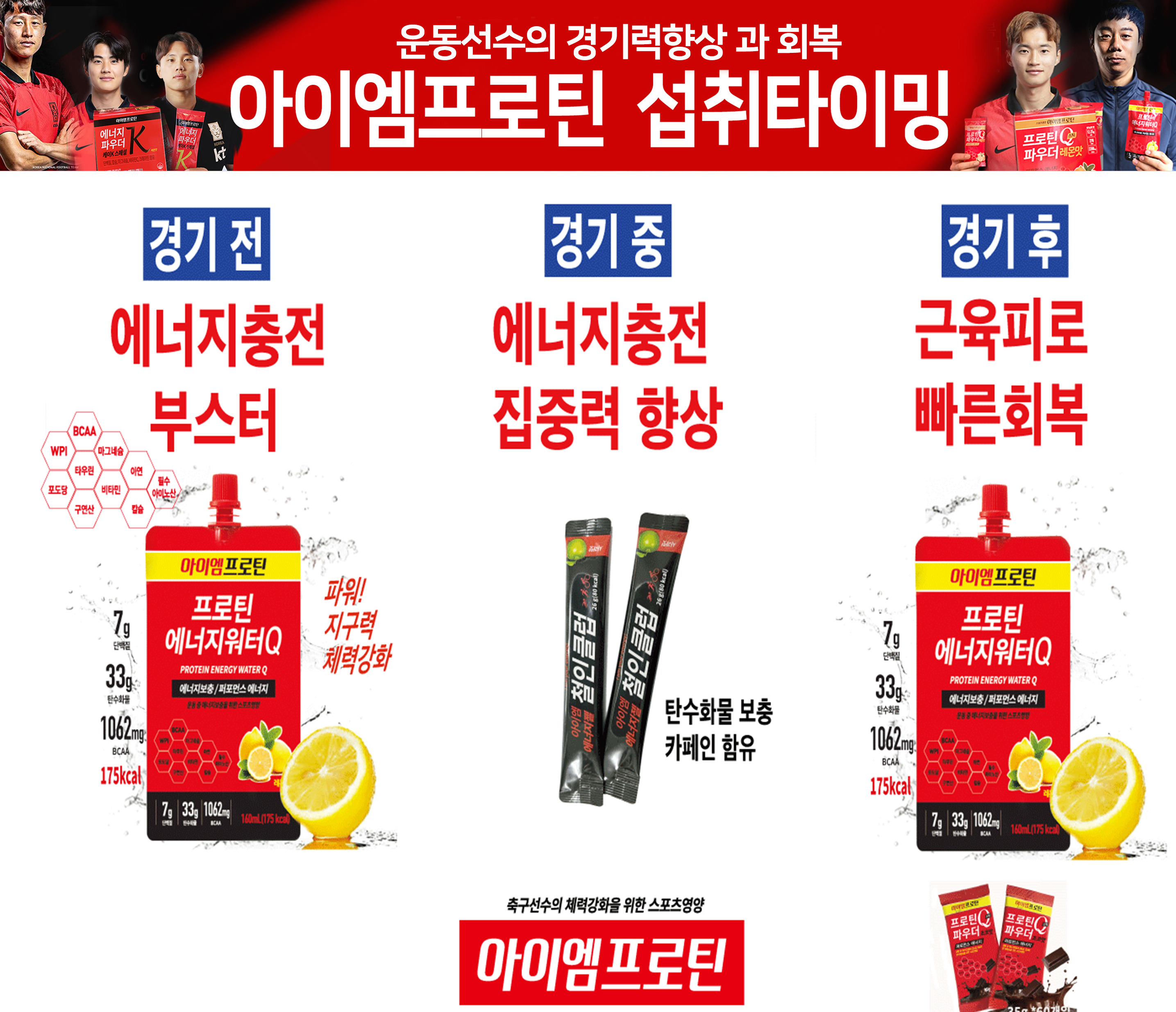 ‘아이엠프로틴’ 같은 스포츠 영양 제품은 축구 선수들에게 필요한 탄수화물·유청단백질·BCAA·비타민·미네랄을 한 번에 공급해준다. 무엇보다 소화와 흡수가 빠르기 때문에, 운동 직후 회복 골든타임을 놓치지 않게 도와준다.