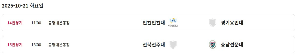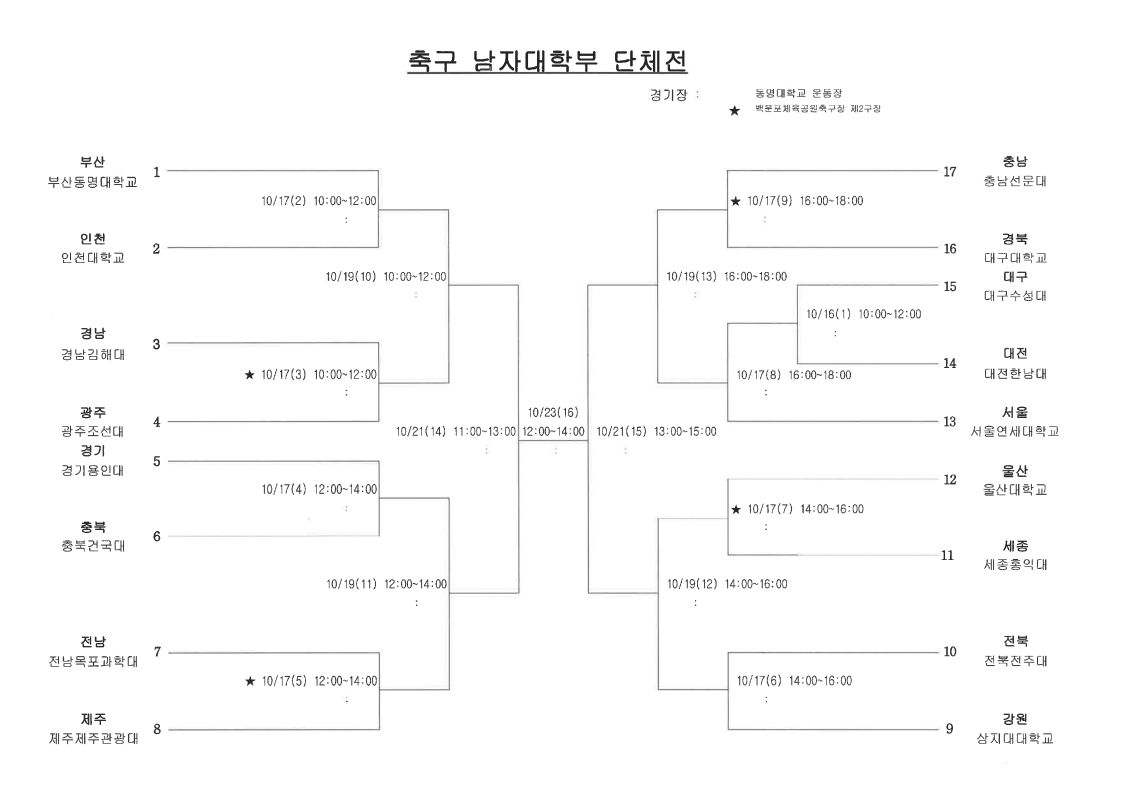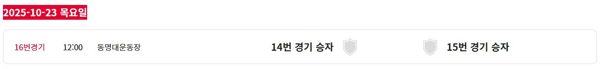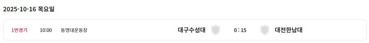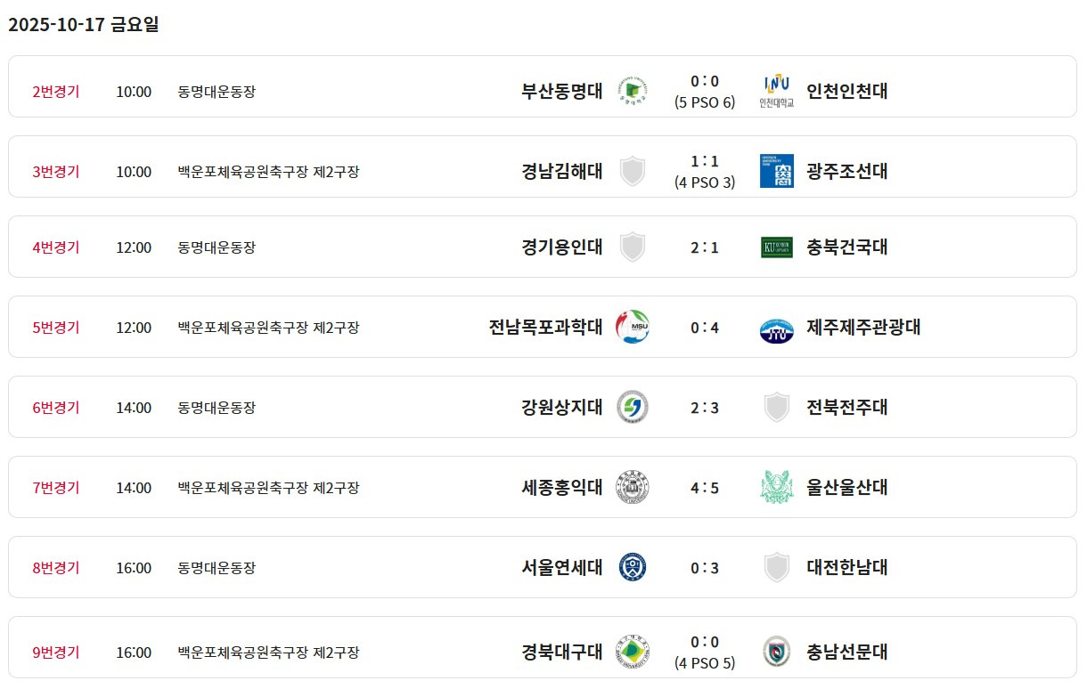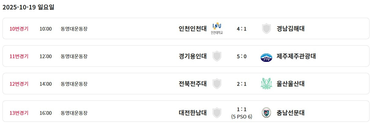 [스크랩] 제106회 전국체육대회(남대학부) 일정&결과(10월16일~23일) 작성자블루문|작성시간25.10.19|조회수383 목록 댓글 1 글자크기 작게가 글자크기 크게가 * 경기장 변경 부경대학교 대연동갬퍼스대운동장------백운포체육공원축구장 제2구장 (8강전) (4강전) (결승전) 다음검색 스크랩 원문 : 풋볼뉴스(Football News) 현재 게시글 추가 기능 열기 북마크 공유하기 신고 센터로 신고 댓글 댓글 1 댓글쓰기 답글쓰기 댓글 리스트 작성자레몬트리 | 작성시간 25.10.20 정보감사합니다 댓글 전체보기