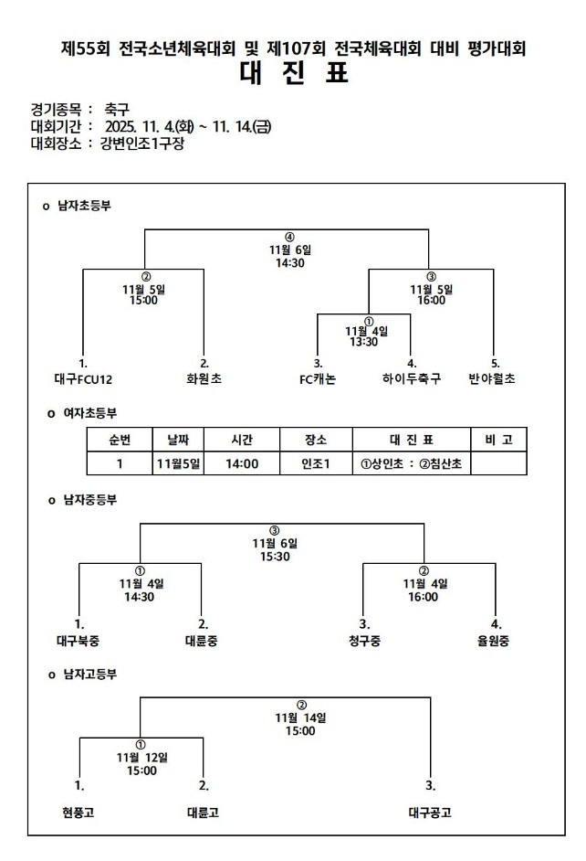 | 1 | 2025-11-05 | 14:00 | 대구상인초 | : | 대구침산초 | 강변인조1번구장 | 1 : 1 (3 P 2) | |