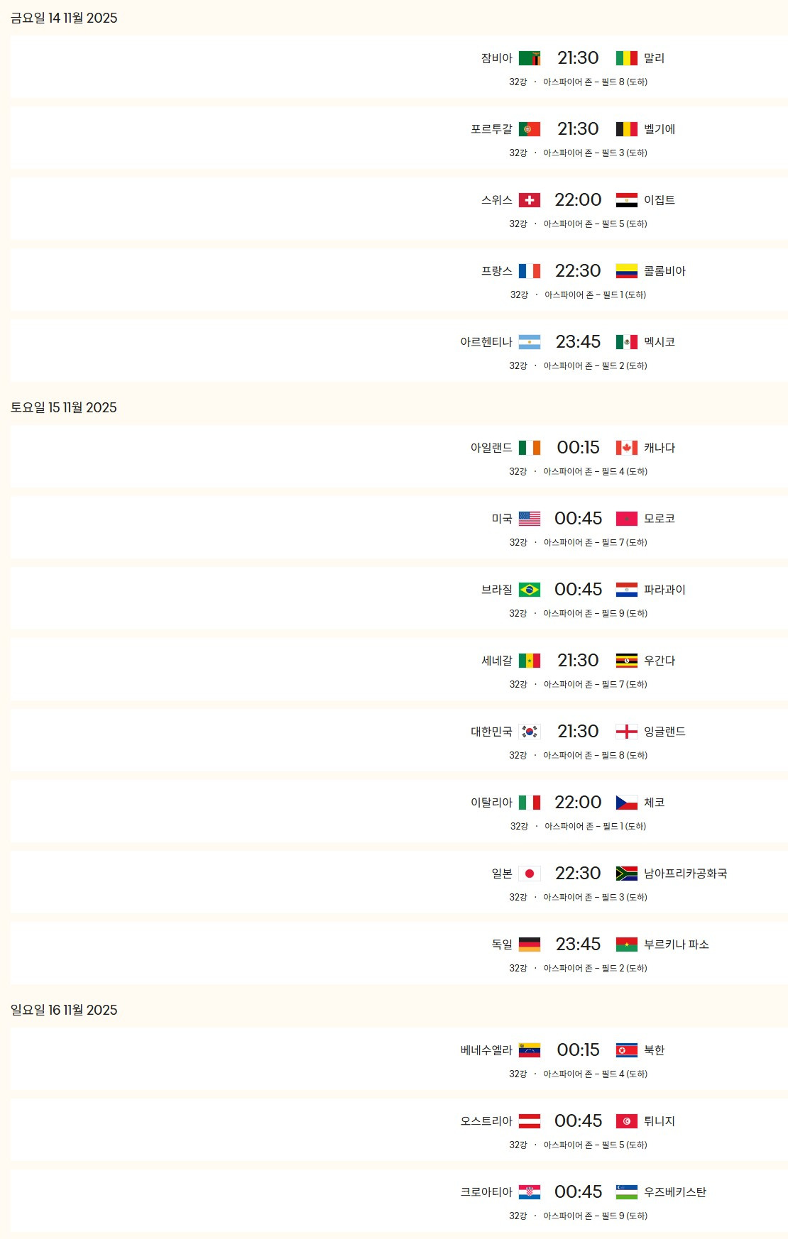 [스크랩] 2025 FIFA U-17 월드컵 32강 대진표 작성자블루문|작성시간25.11.12|조회수591 목록 댓글 2 글자크기 작게가 글자크기 크게가 다음검색 스크랩 원문 : 풋볼뉴스(Football News) 현재 게시글 추가 기능 열기 북마크 공유하기 신고 센터로 신고 댓글 댓글 2 댓글쓰기 답글쓰기 댓글 리스트 작성자축구왕.15 | 작성시간 25.11.12 감사합니다 작성자gkpapa13 | 작성시간 25.11.13 대한민국 화이팅입니다! 댓글 전체보기