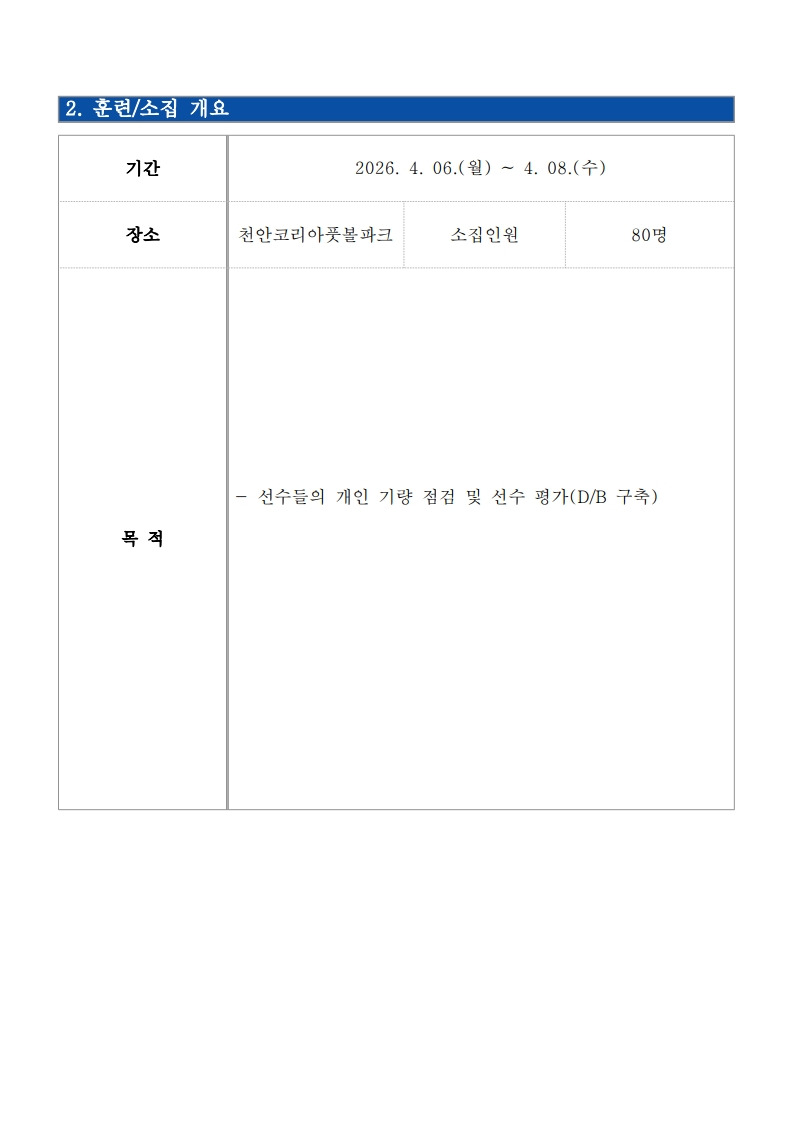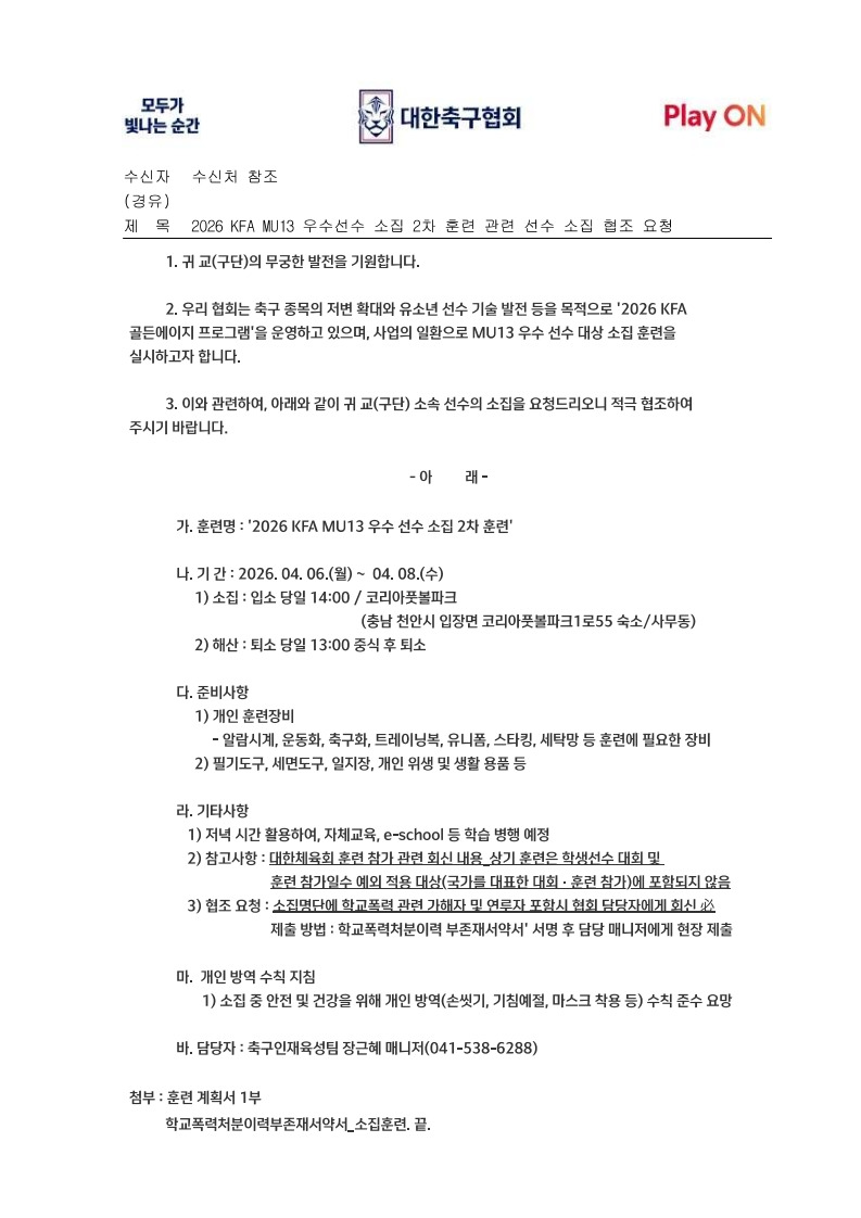 [스크랩] 2026 KFA MU13 우수선수 2차 소집훈련 관련 선수 소집 요청(4월6일~8일=천안코리아풋볼파크) 작성자블루문|작성시간26.03.24|조회수503 목록 댓글 2 글자크기 작게가 글자크기 크게가 다음검색 스크랩 원문 : 풋볼뉴스(Football News) 현재 게시글 추가 기능 열기 북마크 공유하기 신고 센터로 신고 댓글 댓글 2 댓글쓰기 답글쓰기 댓글 리스트 작성자별별나무 | 작성시간 26.03.24 축하합니다 해당 댓글은 작성자와 운영진만 볼 수 있습니다. 댓글 전체보기