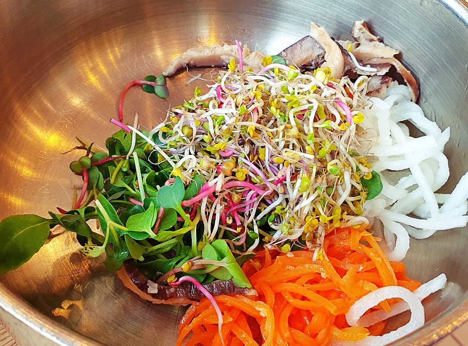 돌솥밥의 밥을 떠서 야채 가득있는 통에서 양념 넣고 비벼먹으면되고
