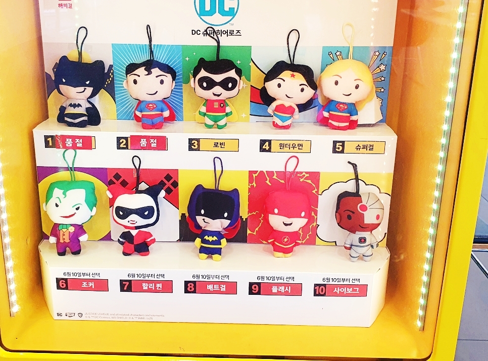 DC 슈퍼히어로즈 라고 해서 베트맨 , 슈퍼맨, 로빈 , 원더우먼, 슈퍼걸 , 조커, 할리퀸 , 베트걸 , 플래시 , 사이보그 이렇게 있는데 베트맨과 슈퍼맨은 품절이래요. 저는 여기서 만약 골라야 한다면 조커 , 우너더우먼 두 종류가 갖고싶어요 ㅎㅎ