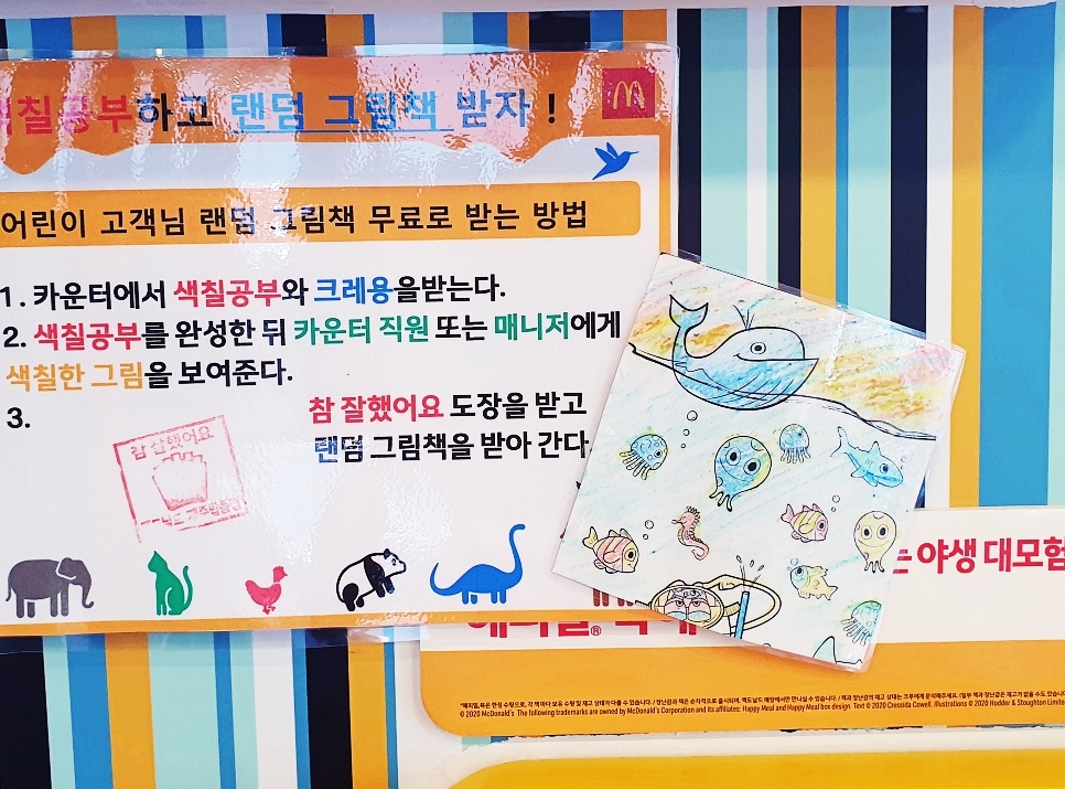 어린이 고객은 카운터에서 색칠공부와 크레용을 받고 색칠한 그림을 직원 / 매니저에게 보여주면 도장을 준대요.