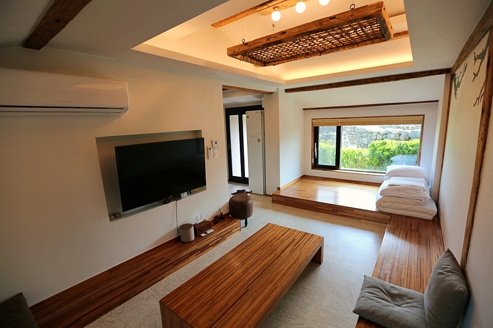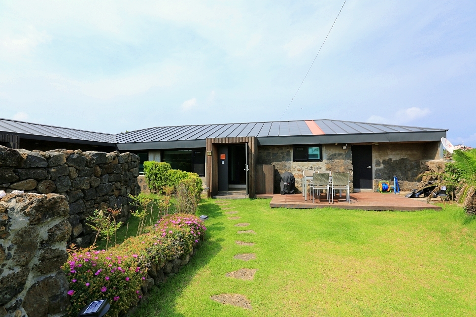 이곳은 잔디밭이 있고 제주식으로 돌담길이 아주 예쁘게 지어진 집인데 2인실과 4인실이 있어요.