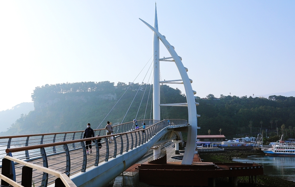 새연교는 서귀포항과 새섬을 연결하는 도로로 낮 시간대에는 다리를 건너 새섬 둘레길을 돌아볼 수 있어요 .