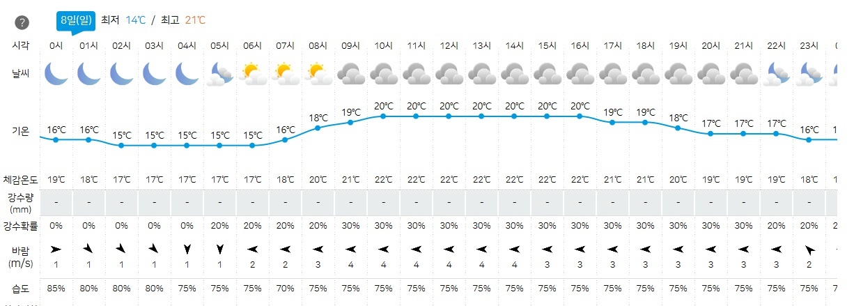 오히려 오늘보다 약간 기온이 떨어질 예정이라고 하고 바람도 1-3m/s로 줄어듭니다.