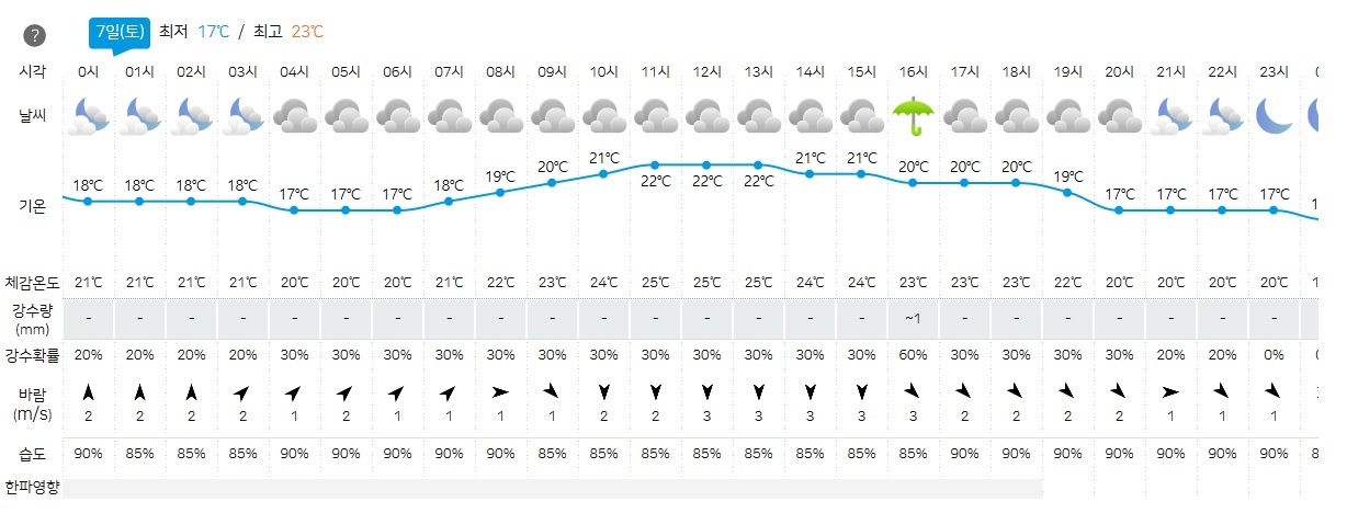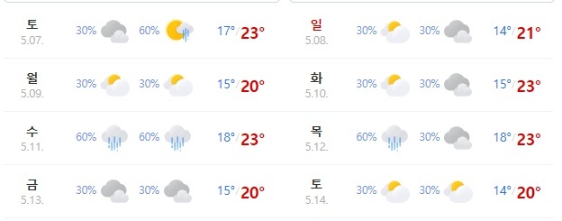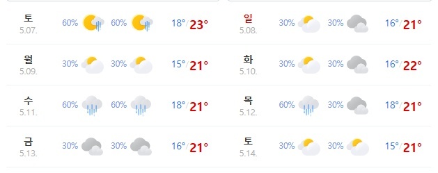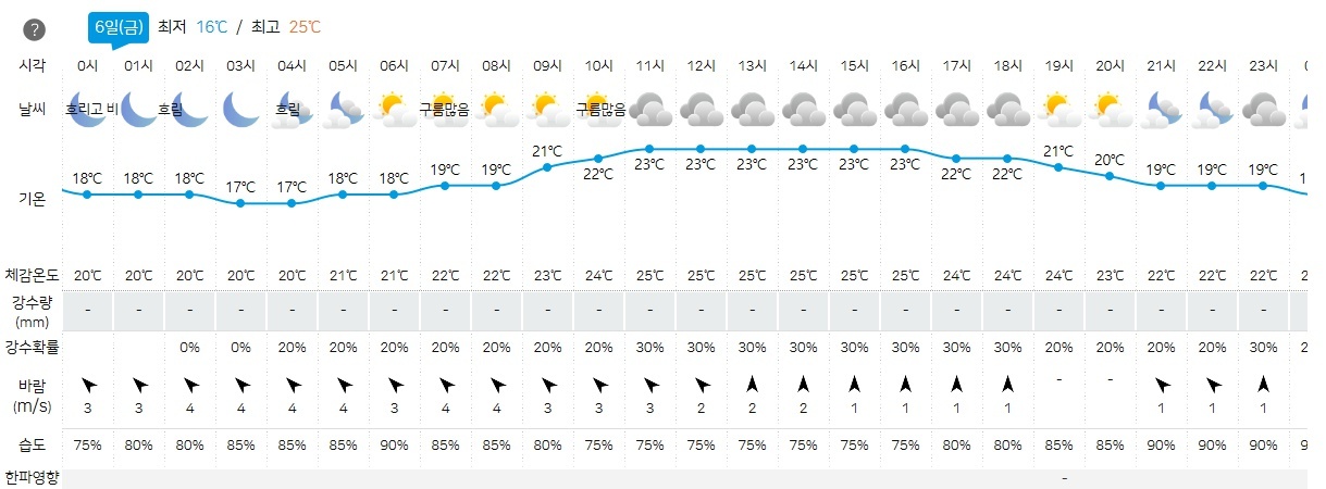 5월 6일 금요일 바람은 3-4m/s 이니 선선하게 꽤 시원한 바람이 불 예정이고 최고기온은 23'c 라고 하니 반팔에 긴바지를 추천드리고 싶습니다.