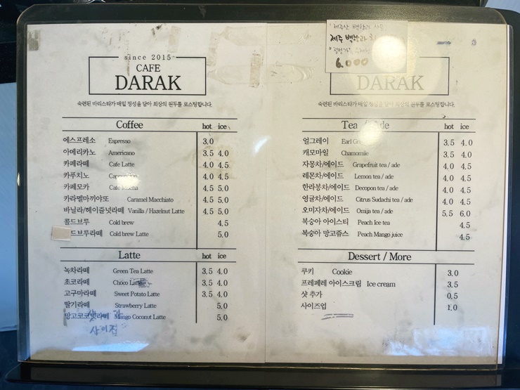 다락 카페 메뉴입니다 △ 며칠전에 촬영한거라서 가격이 그 사이에 오르진 않았을꺼예요.