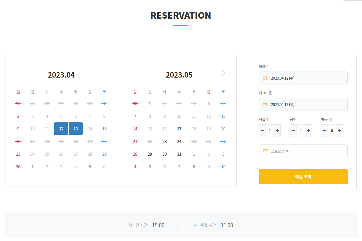 전체 타입의 객실 홈페이지는 4월4일부터 시작되었다고 합니다.