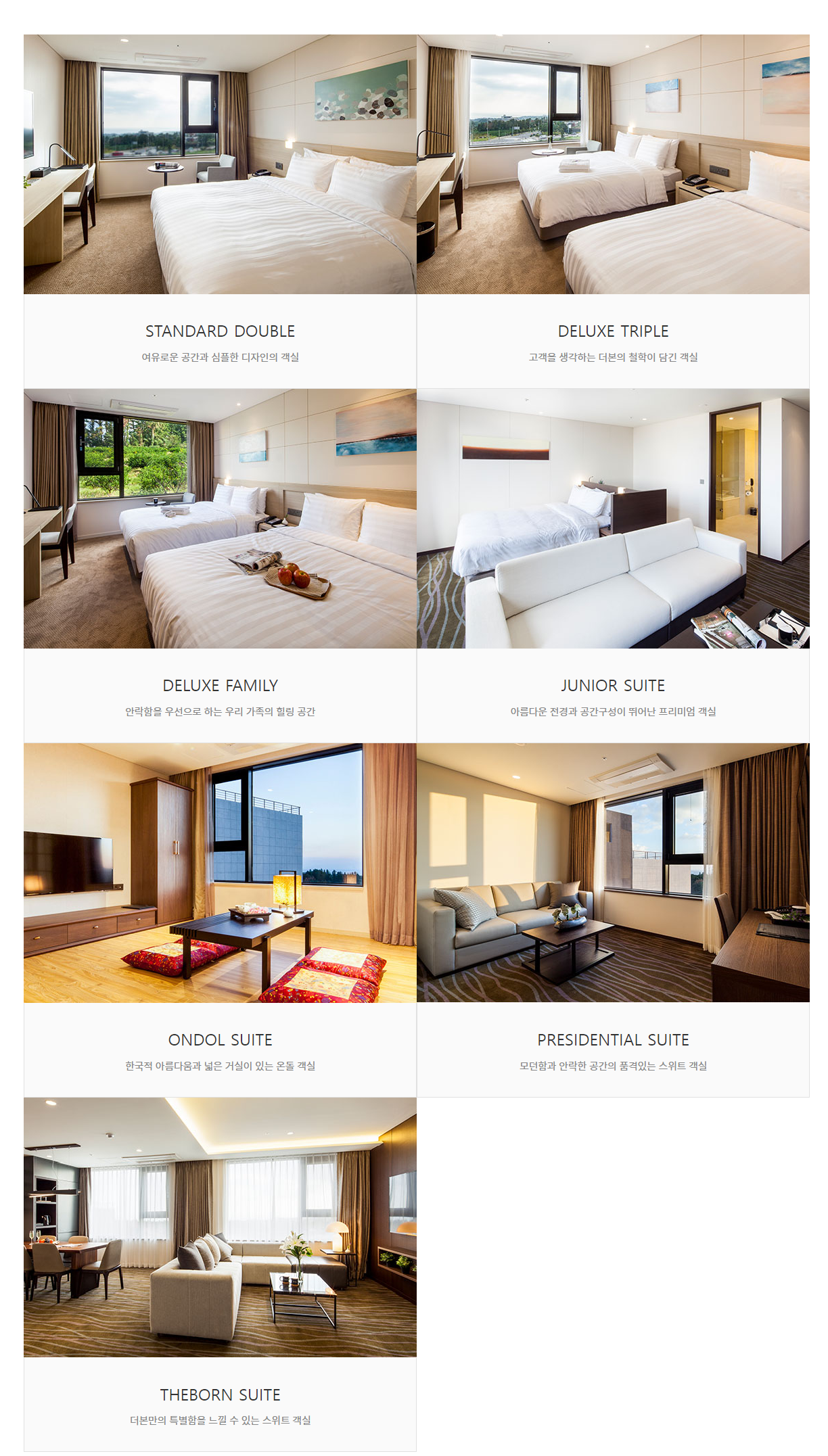 호텔 같은경우 수페리어 , 디럭스 , 이그제큐티브, 온돌, 오션 스위트 , 패밀리 스위트