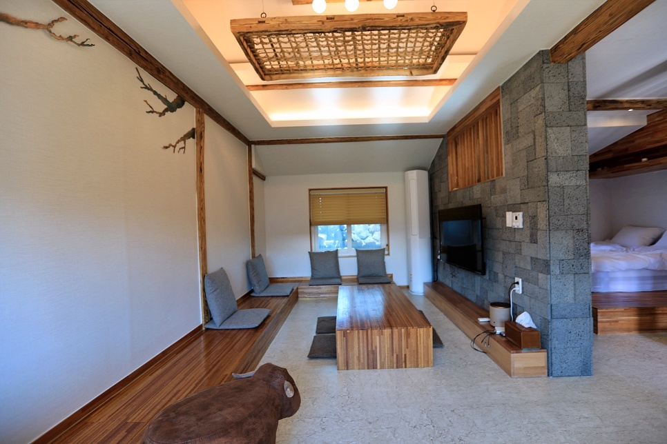 아참 돌담도 제주식으로 만들어져있구요 ^^ 2인실에도 작지만 야외 바베큐 시설 및 잔디밭 있습니다 .