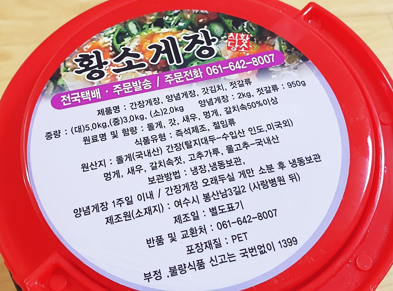 황소게장인데 여수 황소식당에서 판매하고 있는 게장이예요 .