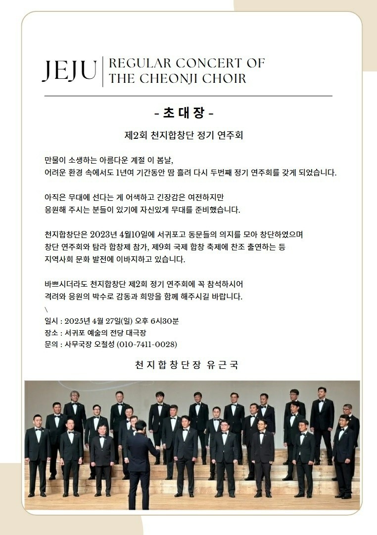 바쁘시더라도 천지합창단 제2회 정기 연주회에 꼭 참석하시어 격려와 응원의 박수로 감동과 희망을 함께 해주시길 바랍니다.