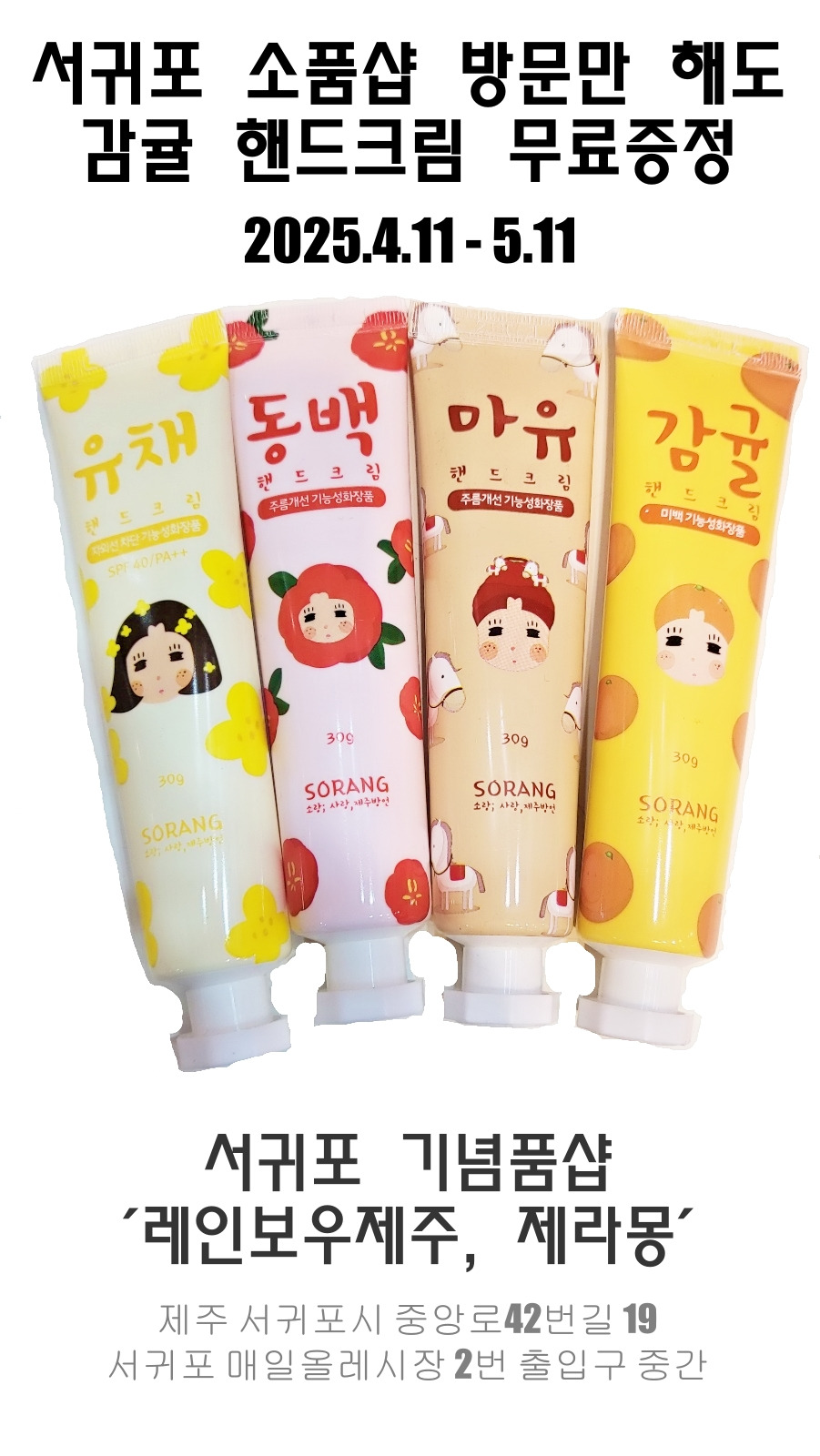 서귀포 올레시장 안에 있는 레인보우제주, 제라몽 서귀포 소품샵에서 방문고객에게 핸드크림을 주는 이벤트를 한다고해요