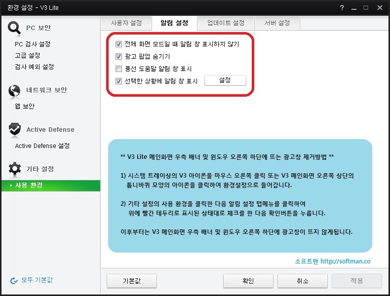 V3 Lite 광고창(배너) 제거방법 작성자소프트맨|작성시간14.10.03|조회수383 목록 댓글 0 글자크기 작게가 글자크기 크게가 컴퓨터 개인사용자들이 백신프로그램으로 많이들 사용하고 있는 V3 Lite 의 경우 컴퓨터를 사용 중 윈도우 오른쪽 하단에 광고창이 뜨거나 V3 를 실행했을 경우 화면 오른쪽에 긴 배너가 함께 뜨곤 하는데요, 만약에 필자처럼 해당 광고창이 눈에 거슬리시는 경우에는 간단하게 V3 환경설정에서 해당 두가지의 광고창을 제거할 수 있습니다. 다음검색 현재 게시글 추가 기능 열기 북마크 공유하기 신고 센터로 신고 댓글 댓글 0 댓글쓰기 답글쓰기 댓글 리스트