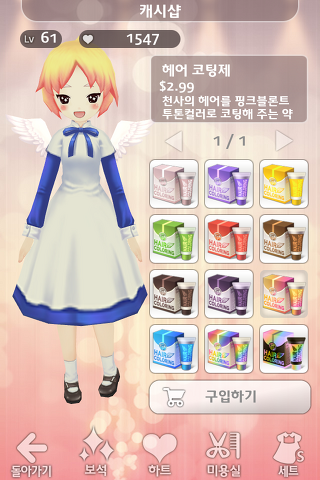: 미용실에서는 천사별로 11가지(기본 헤어색 포함) 색으로 헤어를 염색하는 것이 가능하며,