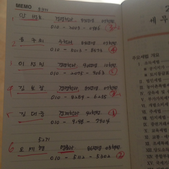 통 가지고 다니지 않던 세무사 수첩을 챙겨와 신입세무사님에게 건네니, 학번과 생년을 적어주었다. 김대중 세무사님을 제외하고는