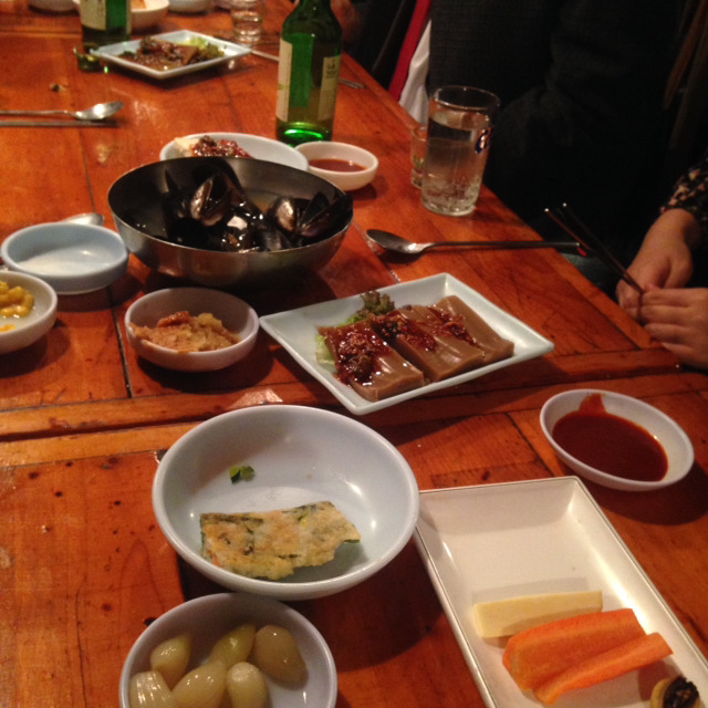 2차로 간 동해횟집의 기본 안주, 나는 개인적으로 오른쪽 고구마를 깍은 것을 좋아한다. 입에 넣고 씹으면 사각사각하고 그 사이로 달콤한 즙이 입안에 가득하다.홍합탕도 제법 시원하다.