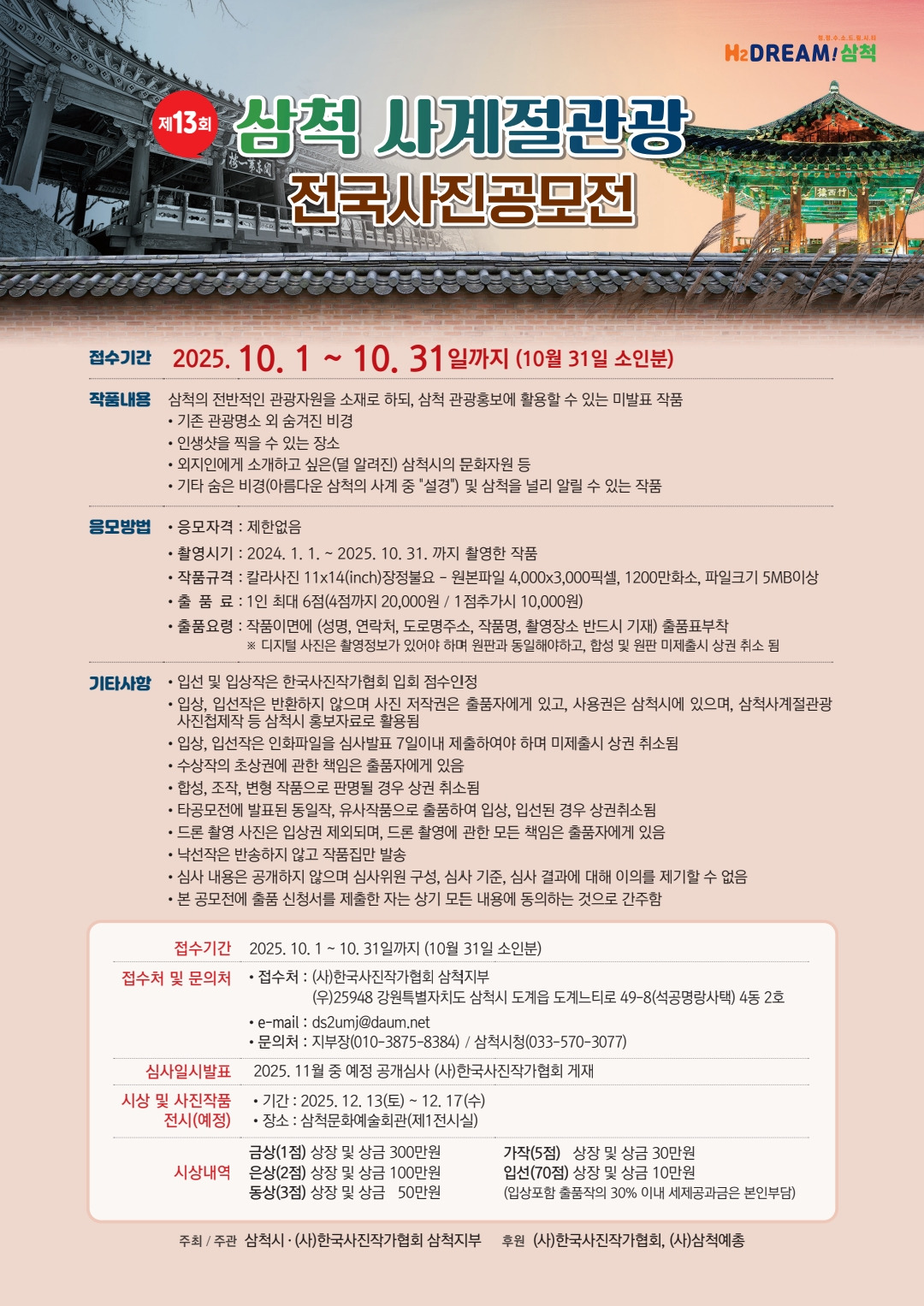 [스크랩] 제13회 삼척사계절관광 전국사진공모전 작성자동해바다/장창근1|작성시간25.09.02|조회수8 목록 댓글 1 글자크기 작게가 글자크기 크게가 다음검색 스크랩 원문 : (사)한국사진작가협회 삼척지부 현재 게시글 추가 기능 열기 북마크 공유하기 신고 센터로 신고 댓글 댓글 1 댓글쓰기 답글쓰기 댓글 리스트 작성자설봉 (김건수) | 작성시간 25.10.04 정보고맙습니다 댓글 전체보기