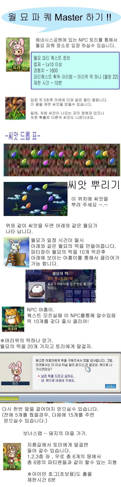 ※ 하는 방법 1.헤네시스 공원에 있는 토리 에게 눌러서 입장. 2.미니맵을 보면 밑에 열매 같은곳이 열리는 곳으로 내려간다. 3.그 열매를 케서 스크린 샷에 보이는 색깔별 위치로 씨앗을 둔다. 4.총 6개가 모이면 월묘 자동 소환 5. 상 하 좌 우 에서 나오는 몬스터를 잡아서 가운데에서 떡만들는 월묘를 보호하자. 6. 월묘가 만들는 떡을 파장이 먹어서 10개를 먹는다 7. 호랑이 에게 가져다 주면 끝난다. ※떡 모자 얻기 떡모자 얻는 법은 월묘가 만들어주는 떡 20개를 모아서 나가는 곳에서 나가게 해주는 npc에게 떡을 준다. 총 20개를 주고 다시 한번 더말하면 준다 (전판에 5개를 줬을 경우. 다음판에는 15개만 주면 20개가 체어지므로 얻을수가 있다.) ※기타 하고 싶은 말 월묘 맵에서 몇몇 분들이 색깔별로 씨앗이 나오는 위치가 랜덤이라고 하길래, 씨앗 나오는 위치가 랜덤이 아니람을 증명하기 위해서 만들게 된 자료 이니 오타 / 문제점이 발견시 댓글에 남겨주시길 바랍니다. 죄송 합니다. 포멧을 해서 포토샵이 없는 관계로 그림판으로라도 해서 만들게 되었으니. 이미지가 이상하더라도 양해 부탁드립니다. ※실험 방법 월묘 총 5번 씨앗을 캠 으로서 색깔별로 씨앗이 정해져 있는 위치에서 나오는 지를 실험. |