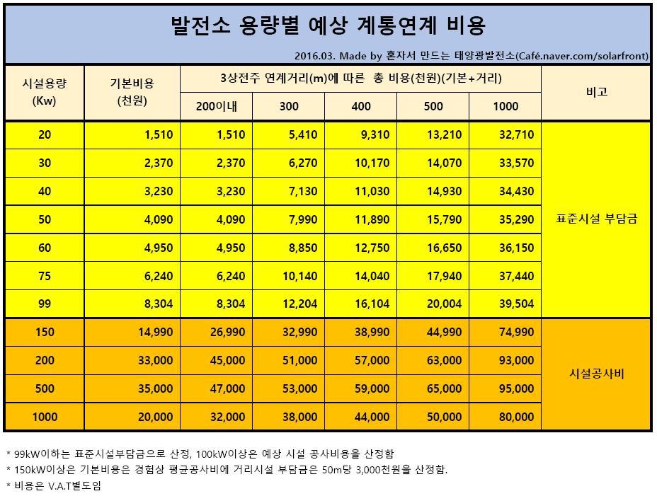 아래 테이블에서 150kW이상은 제 경험치에 의한 비용으로 산정했으니 비용 차이가 있다면 의견주시면 수렴하여 수정하겠습니다.