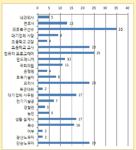 (그림7)에 따르면, 공연예술인력이 자신의 직업과 동일한 직업위세에 든다고 한 응답한 직업은 프로축구선수(35명), 컴퓨터 프로그래머(25명), 초등학교 교사(23명), 요리사(23명), 단순노무자(23명) 등이었다. 직무별로 보면, 프로축구선수는 출연자가 많이 선택하였으며, 컴퓨터 프로그래머는 기술 스태프의 선택이 많았다. 초등학교 교사는 공연 운영 스태프가 많이 선택하였으며, 요리사는 기술 스태프와 창작 스태프의 선택이 많았다. 출연자의 경우는 프로축구선수 뿐만 아니라 단순노무직에도 많은 응답을 했는데, 이는 출연자 직종이 양극화되어 있음을 보여주는 대목이라 하겠다.