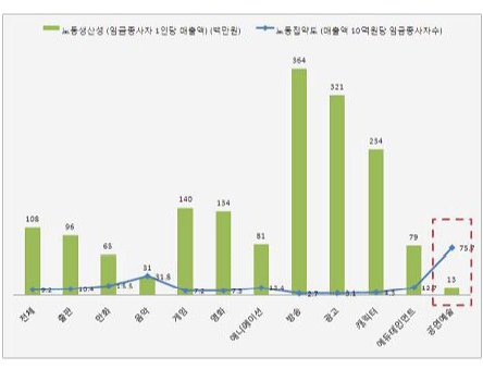 임금종사자 1인당 매출액으로 나타나는 공연산업의 노동생산성은 임금종사자 1인당 약 1천3백만원으로 가장 낮은 것으로 나타났으며, 공연산업 다음으로 낮은 음악산업(약 3천1백만원)보다 2배 이상 높은 것으로 나타났다. 매출액기준에 의한 노동생산성이란 종사자 한 사람이 창출한 매출액을 산출한 지표로서 노동생산성을 말하는데(노동생산성= 매출액/임금종사자), 노동생산성이 높다는 것은 기업이 보유노동력을 효율적으로 이용하여 보다 많은 매출액을 창출했음을 의미한다. 이와 같은 공연산업의 낮은 노동생산성은 해당 산업의 높은 노동집약도에 의해 나타난 결과라고 볼 수 있다.