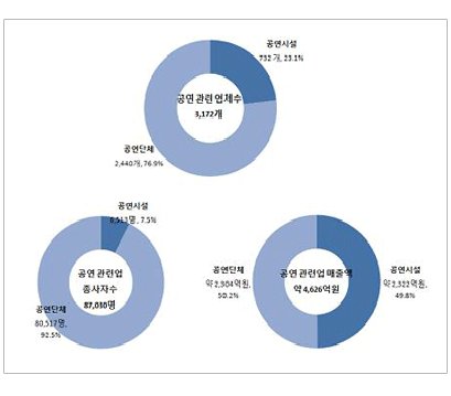종사자수는 전체 54만 5천 940명 중 공연산업이 차지하는 비중은 15.9%(87,030명)로 출판업 다음으로 높은 종사자수 비중을 차지하는 것으로 나타났다.