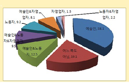 이와 같은 결과를 종합해보면, 공연예술분야에 종사하는 인력은 자신을 예술인이라 생각하지만 노동자가 아니라거나 자영업자가 아니라는 배타적인 자기규정도 없다는 것을 알 수 있다. 그리고 자신의 직업위세에 대해서도 단순노무자에서 프로축구선수까지 그야말로 다양한 스펙트럼으로 인식하고 있다는 사실도 확인할 수 있다.