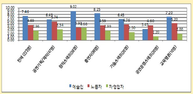 그 결과 (그림4)에 나타난 것과 같이 응답자들은 ‘예술인’에 7.46점, '노동자'에 4.69점, '자영업자'에 2.96점을 부여하여 평균적으로 예술인에 가깝다는 인식을 가지고 있음을 알 수 있었으며 자영업자라기보다는 노동자라는 인식이 더 강한 것을 알 수 있었다. 이러한 인식은 창작 스태프(9.02점)와 출연자(8.25점)의 경우에 두드러졌으며, 공연운영 스태프(3.45점)의 경우에는 낮은 편이었는데, 공연운영 스태프의 경우는 '노동자'라는 인식이 4.60점으로 '예술가'라는 인식보다 높았다. 그리고 전체적으로 예술가라는 인식이 낮은 직종일수록 ‘노동자’라는 인식이 상대적으로 높게 나타나고 있음을 알 수 있다.